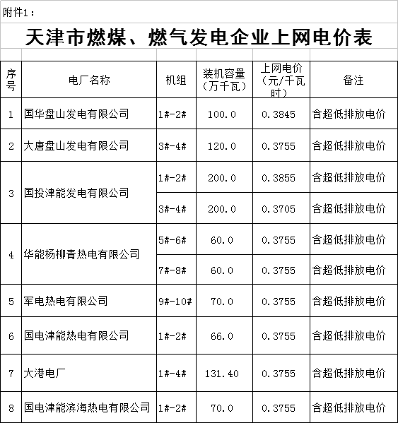 ˙燃煤和燃氣發(fā)電機組上網電價表