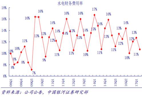 2017年1-6月,水電行業(yè)財(cái)務(wù)費(fèi)用69.9億元,同比減少10.9%;財(cái)務(wù)費(fèi)用率12%,較去年同期下降2個(gè)百分點(diǎn)。二季度,水電財(cái)務(wù)費(fèi)用34.7億元,同比銳減三成;財(cái)務(wù)費(fèi)用率10.7%,同比下降3.7個(gè)百分點(diǎn),環(huán)比減少2個(gè)百分點(diǎn);綜合資金成本5.6%,同比下降1.7個(gè)百分點(diǎn)。
