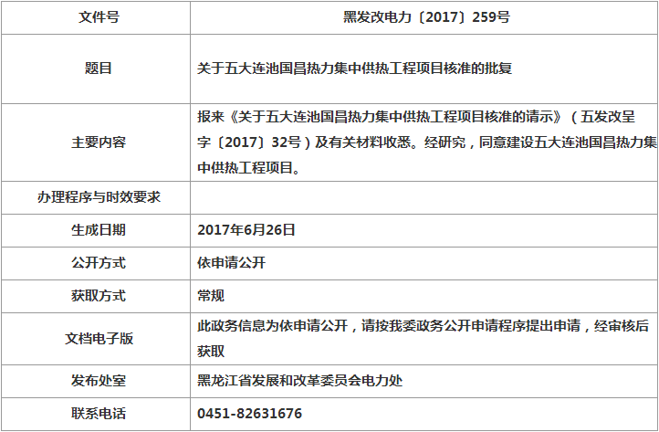 關(guān)于五大連池國昌熱力集中供熱工程項目核準的批復(fù)