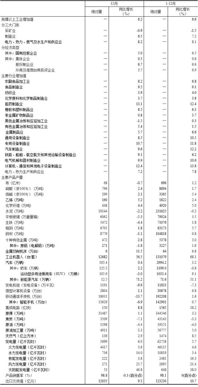 分三大門(mén)類(lèi)看,12月份,采礦業(yè)增加值同比下降0.9%,制造業(yè)增長(zhǎng)6.5%,電力、熱力、燃?xì)饧八a(chǎn)和供應(yīng)業(yè)增長(zhǎng)8.2%。