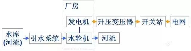 水庫的水經(jīng)引水系統(tǒng)流入廠房推動(dòng)水輪發(fā)電機(jī)組發(fā)出電能,再經(jīng)升壓變壓器、開關(guān)站和輸電線路輸入電網(wǎng)。
