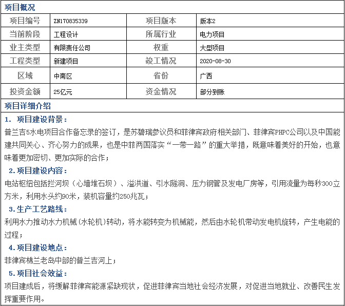 近期優(yōu)質(zhì)電力項目一覽,包括1個火電項目,2個水電項目,分別是菲律賓普蘭吉水電公司(PHPC)菲律賓普蘭吉五250MW水電站項目、華能國際電力股