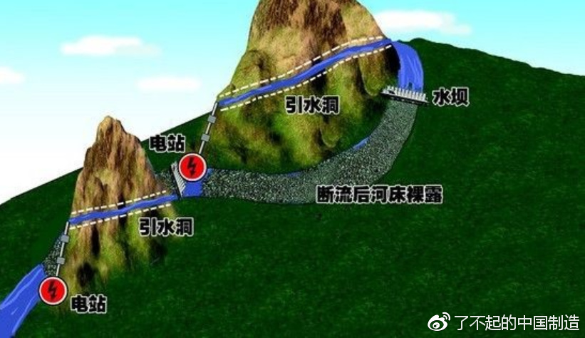 不同于整體性的混凝土壩可以將發(fā)電設(shè)備直接嵌入壩體內(nèi),土石壩的內(nèi)部是實心堆積的砂土,因此水壩只是將水?dāng)r住,再通過一條引水洞將水引出,在下游布置電站。這樣,相當(dāng)于將整條河流裝進了一條密閉通道中,最大限度地利用河水的動能。