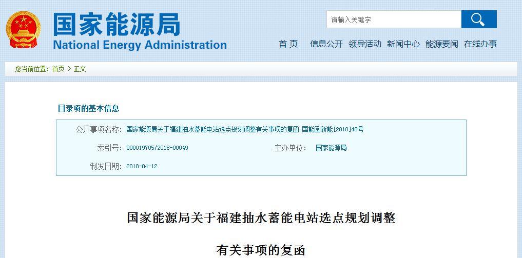 國家能源局關(guān)于福建抽水蓄能電站選點(diǎn)規(guī)劃調(diào)整有關(guān)事項(xiàng)的復(fù)函