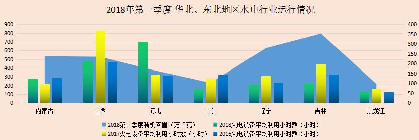 從水電設(shè)備平均利用小時(shí)數(shù)上看,2018第一季度,除河北省超過全國(guó)平均水平,達(dá)到705小時(shí)外,華北、東北普遍處于較低水平,其中黑龍江省最低,僅為135小時(shí)。