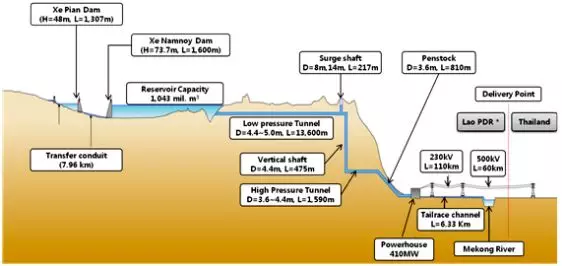 該工程由PNPC公司(Xe-Pian Xe-Namnoy Power Company)投資,2013年2月開始建設(shè),計(jì)劃2019年投產(chǎn)發(fā)電。PNPC公司是韓國SK建設(shè)株式會(huì)社(SKEC,持股26%)、泰國Ratchaburi發(fā)電公司(RATCH,持股25%)、韓國西部電力(KOWEPO ,持股25%)和老撾控股國有企業(yè)(LHSE,持股24%)于2012年3月組成的合資企業(yè)。該項(xiàng)目投資約10.2億美元,PNPC公司與老撾政府簽署了特許經(jīng)營協(xié)議,電站投入商業(yè)運(yùn)營后特許經(jīng)營27年,370MW的電力將出售給泰國電力公司(EGAT),40MW的電力將出售給老撾電力公司(EDL)。