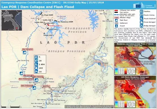 圖8 潰壩洪水路線及受影響區(qū)域(源自歐盟聯(lián)合研究中心,7月25日)
