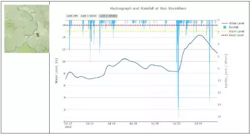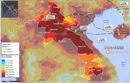 總體上看,季風(fēng)季節(jié)以及熱帶風(fēng)暴Son-Tinh過境引起的持續(xù)強(qiáng)降雨是導(dǎo)致洪水和潰壩發(fā)生的直接原因。全球?yàn)?zāi)害預(yù)警與協(xié)調(diào)系統(tǒng)(GDACS, Global Disaster Alerting Coordination System)曾于2018年7月15日發(fā)布Son-Tinh熱帶風(fēng)暴暴雨橙色預(yù)警,受影響區(qū)域包括菲律賓、中國、越南和老撾等地區(qū)。距離受災(zāi)區(qū)域不遠(yuǎn)的Ban Veunkhen水文站點(diǎn)數(shù)據(jù)(圖10)顯示,隨著Son-Tinh熱帶風(fēng)暴7月20-21日過境導(dǎo)致的強(qiáng)降雨(7月15日-24日累計(jì)降雨量見圖10),河道水位快速上漲,7月24日達(dá)到峰值。