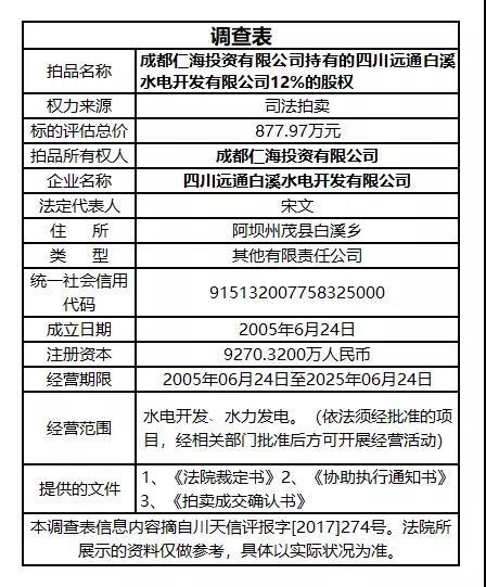 拍賣 | 成都仁海投資公司持有的四川遠(yuǎn)通白溪水電開(kāi)發(fā)公司12%的股權(quán) 9月25日開(kāi)拍