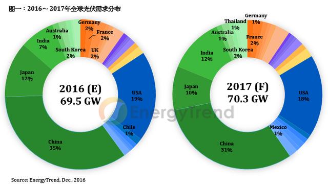 印度及新興市場的成長幅度未能彌補(bǔ)中、美、日的需求衰退,一線組件廠為鞏固出貨,其2017年報價頻破底,預(yù)估組件市場均價將由2017年初的US$ 0.38/W,跌至年底的US$0.33/W,不僅中上游廠商將面臨極大虧損,一線組件廠也難維持過去15%以上的毛利區(qū)間。整體而言,2017年光伏供應(yīng)鏈由上至下利潤都將低于2016年水平。