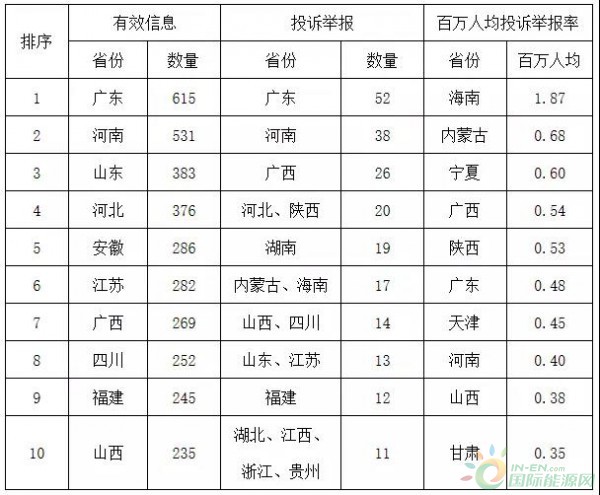 2017年9月,各?。ㄗ灾螀^(qū)、直轄市)按照有效信息數(shù)量排序,廣東、河南、山東等省列全國前10位;按照投訴舉報(bào)數(shù)量排序,廣東、河南、廣西等省排在全國前10位;按照百萬人均投訴舉報(bào)率排序,海南、內(nèi)蒙古、寧夏等省位于全國前10位。