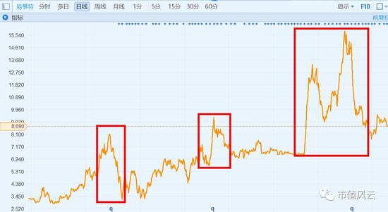 在二級(jí)市場(chǎng)上,易事特的K線圖是這樣的,三個(gè)紅框處非常標(biāo)準(zhǔn)漂亮地復(fù)制了大幅上漲,快速下跌的行情,就像是一個(gè)模子里刻出來(lái)的。