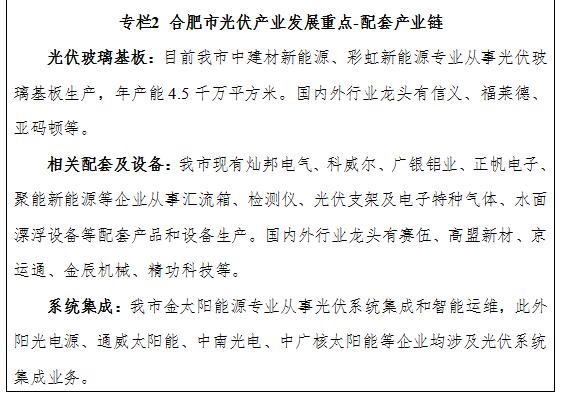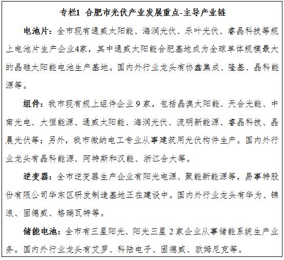 通過采取鞏固一批、拓展一批、培育一批、引進(jìn)一批等措施,持續(xù)推進(jìn)光伏重點(diǎn)項(xiàng)目建設(shè),繼續(xù)壯大產(chǎn)業(yè)規(guī)模。鞏固一批,支持晶澳太陽能、通威太陽能、陽光電源等龍頭企業(yè)繼續(xù)加大技術(shù)改造和產(chǎn)品研發(fā)力度,繼續(xù)保持國內(nèi)乃至全球領(lǐng)先地位。拓展一批,爭(zhēng)取海潤光伏、三星SDI、樂葉光伏、彩虹新能源、天合光能、中建材新能源等國內(nèi)外重點(diǎn)光伏企業(yè)搶抓新能源產(chǎn)業(yè)發(fā)展機(jī)遇,加大在肥投資力度,擴(kuò)大企業(yè)規(guī)模。培育一批,積極支持中南光電、睿晶科技、大恒能源、晶晨光伏、流明新能源、聚能新能源、微納電工等本地一批中小企業(yè)發(fā)展壯大。引進(jìn)一批,主動(dòng)吸引國內(nèi)外電池片、組件、逆變器重點(diǎn)企業(yè),特別是光伏輔材、建筑用光伏構(gòu)件、薄膜發(fā)電、光熱發(fā)電產(chǎn)品重點(diǎn)生產(chǎn)企業(yè)和光伏生產(chǎn)設(shè)備制造企業(yè)集聚我市,建設(shè)世界級(jí)光伏產(chǎn)業(yè)集群。