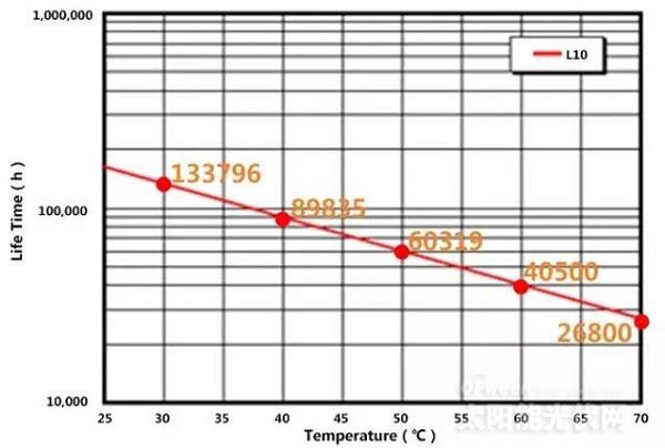 以組串式逆變器最惡劣環(huán)境溫度50℃考慮,風(fēng)扇正常運(yùn)行時(shí)間可達(dá)60319小時(shí)。一般逆變器廠家會(huì)采用智能強(qiáng)制風(fēng)冷控制,只有在逆變器模塊溫度達(dá)到70℃以上時(shí)風(fēng)扇才會(huì)滿轉(zhuǎn)。在正常一天內(nèi),風(fēng)扇滿轉(zhuǎn)時(shí)間大約為6小時(shí),陰雨天情況下運(yùn)行時(shí)間會(huì)縮短,以此為計(jì)算條件可得風(fēng)扇使用壽命約為60319/6/365=27.5年。