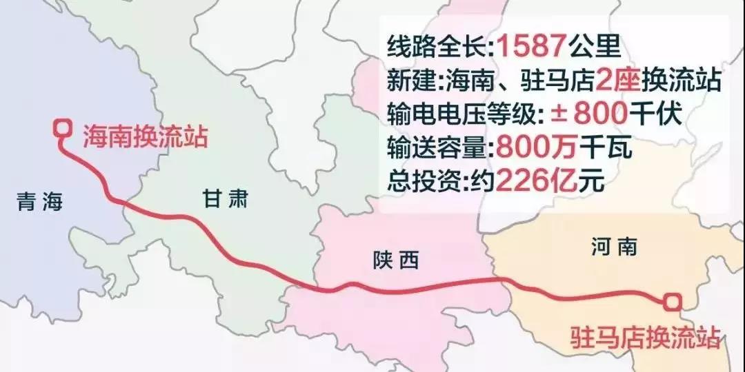 青海—河南特高壓工程起于青海省海南藏族自治州,止于河南省駐馬店市,途經(jīng)青海、甘肅、陜西、河南等4省,線路全長1587公里,新建海南、駐馬店2座換流站,輸電電壓等級為±800千伏,輸送容量800萬千瓦,總投資約226億元,于2018年10月獲得國家發(fā)改委核準,計劃2020年建成投運。該工程是世界上首個以服務光伏發(fā)電為主、全清潔能源打捆外送的特高壓工程,是解決新能源大規(guī)模并網(wǎng)消納難題的重大創(chuàng)新工程和典范工程。