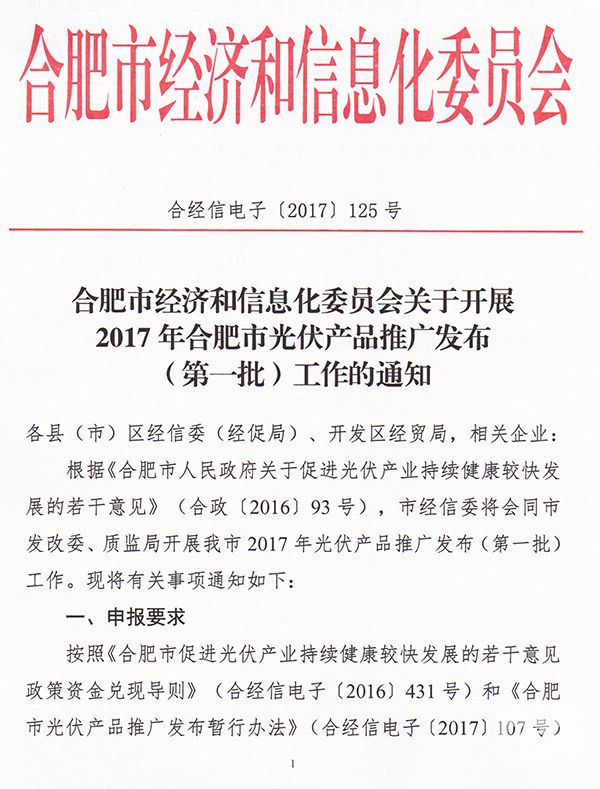 安徽合肥2017年光伏產(chǎn)品推廣發(fā)布(第一批)開始申報(bào)