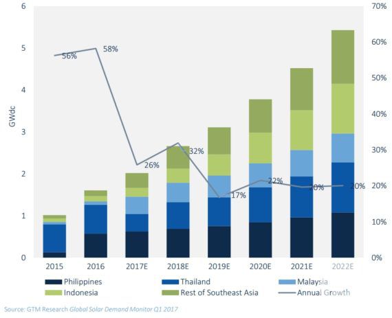 報(bào)告還強(qiáng)調(diào)泰國和馬來西亞等東南亞國家的潛在增長機(jī)會(huì)。GTM預(yù)計(jì),由于慷慨和日益增加的清潔能源關(guān)稅,2017-2022年,泰國的新增太陽能容量將超4.6吉瓦。