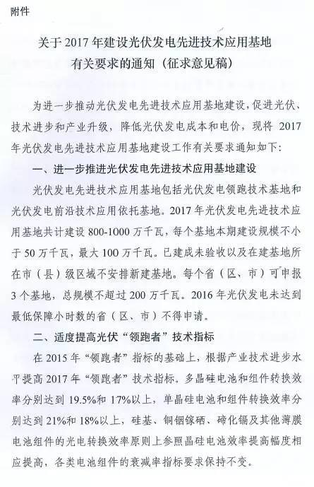 近日,華夏能源網(wǎng)(微信號sinoergy_com)獲悉,國家能源局綜合司發(fā)出了名為《關于2017年建設光伏發(fā)電先進技術應用基地有關要求的通知》的征求意見稿,對光伏發(fā)電先進技術應用基地建設的規(guī)劃、優(yōu)選、評分規(guī)則等做意見征集。
