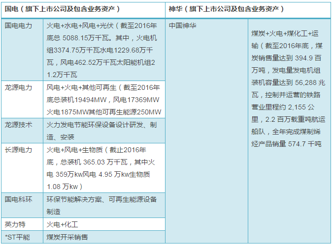 國電集團(tuán)旗下主要有國電電力、龍?jiān)措娏Α堅(jiān)醇夹g(shù)、長(zhǎng)源電力、國電科環(huán)、英力特、*ST平能等幾家上市公司,神華集團(tuán)旗下主要有中國神華一家。