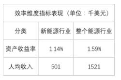 就效率維度而言,新能源企業(yè)在效率維度上的三項指標均低于能源行業(yè)整體的平均水平,尤其是人均營業(yè)收入這一項不足能源行業(yè)整體水平的三分之一,這一差距跟新能源企業(yè)總收入在能源行業(yè)中偏低有關。