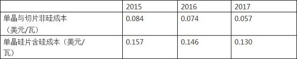 未來三年內(nèi),單晶硅片含硅成本將下降17%,單位成本降低至13美分/瓦。