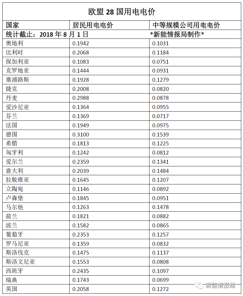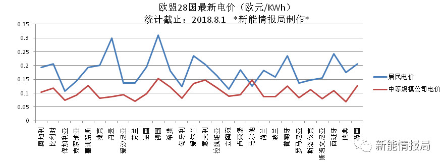 截止2018年8月1日,根據(jù)新能情報局統(tǒng)計,歐盟28國中,其中居民用電電價最高的國家為德國,達到了0.31歐元/KWh,排前五的國家分別為德國、丹麥、西班牙、愛爾蘭、葡萄牙。