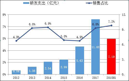 2018H1研發(fā)支出占營業(yè)收入比例7.18%,創(chuàng)歷史新高