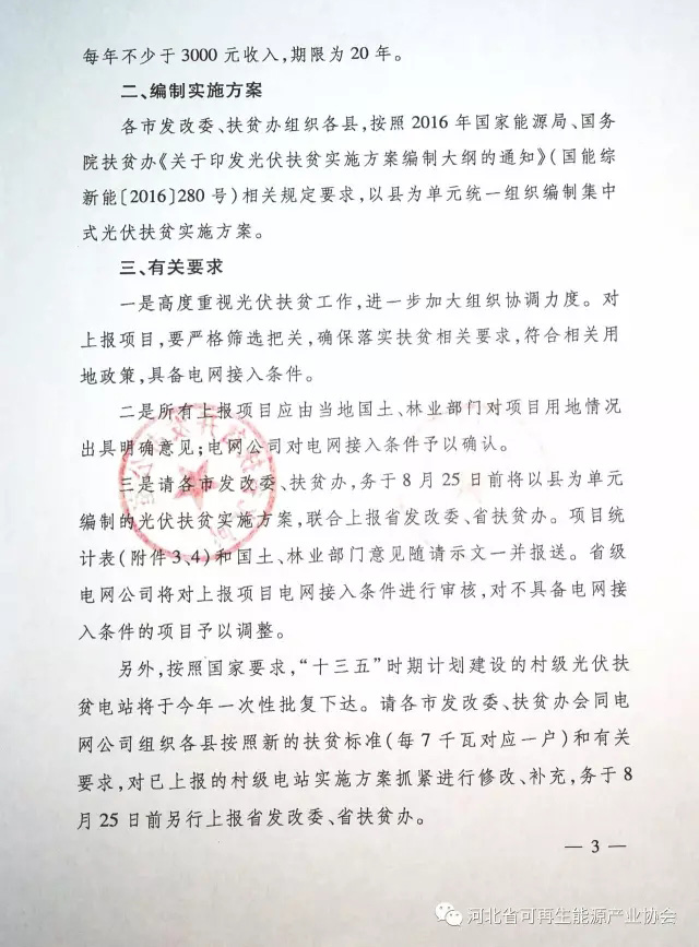 近日,河北省發(fā)改委及扶貧辦聯(lián)合下發(fā)《關(guān)于開展2017年集中式光伏扶貧項目申報工作的通知》(下簡稱通知),通知規(guī)定:集中式光伏扶貧電站可按每30千瓦對應(yīng)一戶,保障每戶每年不少于3000元收入,期限為20年,光伏扶