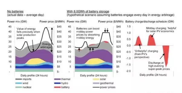 我們通常認(rèn)為,電池與可再生能源之間存在高度共生關(guān)系,即電池將在有可再生能源電力產(chǎn)出的時(shí)段充電,并在其他時(shí)段放電。從多個(gè)層面來(lái)說(shuō),這種設(shè)計(jì)都非常合理。本質(zhì)而言,電池可通過(guò)將低價(jià)值時(shí)段的可再生能源電力產(chǎn)出轉(zhuǎn)移至高價(jià)值時(shí)段,實(shí)現(xiàn)“能源套利”,從而降低電網(wǎng)的短期成本,并為可再生能源項(xiàng)目帶來(lái)收益。
