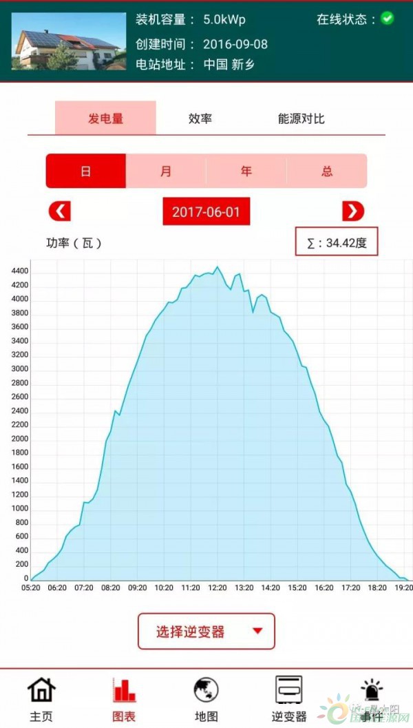 從截圖中我們可以看出,這座位于河南新鄉(xiāng)的5kW電站,從早上5點(diǎn)20分開始到晚上7點(diǎn)30分,光伏電站都是在發(fā)電,一天持續(xù)14小時(shí)為你賺錢。由于當(dāng)天天氣較好,發(fā)電量更是達(dá)到了34.42度,非??捎^。估計(jì)那天用戶都快笑壞了吧,哈哈~