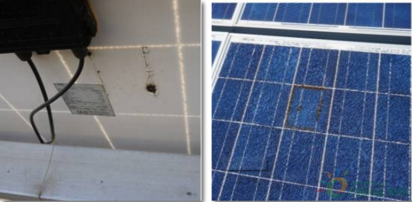 在一期10MW光伏電站中使用PVDF背板的組件出現(xiàn)了正面玻璃破裂,PVDF背板灼燒開裂的現(xiàn)象。背板開裂除了影響組件的發(fā)電效率以及生命周期之外,更需要注意的是這意味著組件存在漏電等安全風險,無疑增大了投資企業(yè)的潛在風險。