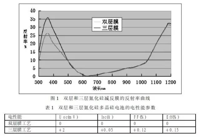 將雙層和三層氮化硅膜所做的太陽(yáng)電池分別進(jìn)行電性能測(cè)試,結(jié)果見(jiàn)表1。從表1中看出,三層膜的太陽(yáng)電池的開路電壓比雙層膜的提高2mV,另外三層膜太陽(yáng)電池的短路電流也比雙層膜的提高了0.05A。分析原因開路電壓的提高應(yīng)該與三層氮化硅膜的少子壽命高于雙層膜,鈍化效果較好有關(guān);而短路電流的提升主要是由于三層膜的實(shí)驗(yàn)片短波部分反射率較雙層膜的低,從而增加了光的吸收,所以短路電流略有提高。開路電壓與短路電流的提升,最終使三層氮化硅膜多晶太陽(yáng)電池比傳統(tǒng)雙層膜的光電轉(zhuǎn)換效率提高了0.15%。