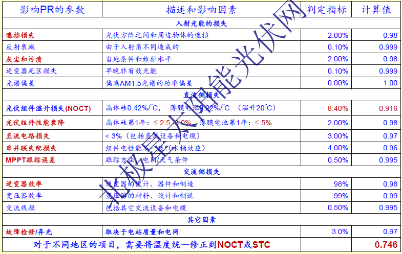 能效比PR代表了光伏系統(tǒng)的質(zhì)量好壞:是否具備長(zhǎng)期運(yùn)行的可靠性;是否具有光伏系統(tǒng)各個(gè)環(huán)節(jié)長(zhǎng)期運(yùn)行的高效率;排除了當(dāng)?shù)刭Y源差異的影響;下表判定指標(biāo)基于晶硅組件,溫升損失8.4%(NOCT電池結(jié)溫45度左右)。