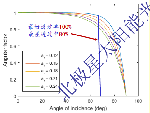 1、陽(yáng)光入射角在50度以內(nèi)時(shí)反射損失很小,50度以上時(shí) 隨著入射角增大,反射損失增 大; 2、角度因子(縱軸)代表了入射光的比例(陽(yáng)光入射率) ,越高越好; 3、ar代表了減反射這條藍(lán)線,和光伏組件的減反射功能好壞有關(guān),即便入射角達(dá)到70%,最好的透過(guò)率100%,最差的透過(guò)率80%,這也是一個(gè)非常重要的指標(biāo),來(lái)定量化組件的反射損失,
