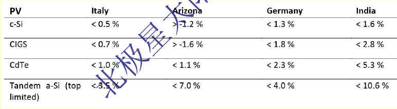光譜適配損失,非晶硅(a-Si) 和碲化鎘(CdTe)組件對(duì)于光譜分布很敏感,需要進(jìn)行光譜修正,對(duì)于晶體硅(C-Si)和銅銦鎵硒(CIGS)組件不需要,光譜偏離的誤差很小。
