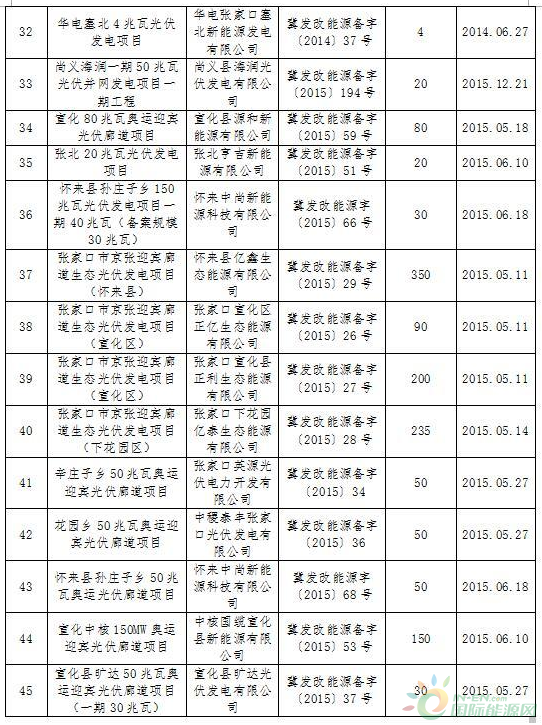 按照河北省能源局《關(guān)于一次性報(bào)送光伏發(fā)電項(xiàng)目備案證過期影響土地、環(huán)評(píng)、發(fā)電許可等手續(xù)辦理出具意見請(qǐng)示的通知》要求,張家口市共上報(bào)項(xiàng)目46個(gè)、備案規(guī)模3009兆瓦(其中含風(fēng)電項(xiàng)目1個(gè)、400兆瓦)。經(jīng)審核,符合要求的光伏發(fā)電項(xiàng)目共45個(gè)、備案規(guī)模2609兆瓦。