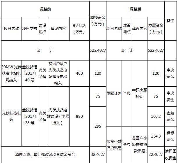 經(jīng)縣脫貧攻堅(jiān)領(lǐng)導(dǎo)小組研究,決定調(diào)整《金寨縣2017年第二批財(cái)政專項(xiàng)扶貧資金項(xiàng)目計(jì)劃》中“光伏扶貧電站”項(xiàng)目計(jì)劃、《金寨縣2017年第三批財(cái)政專項(xiàng)扶貧資金項(xiàng)目計(jì)劃》中“30MW光伏扶貧電站電網(wǎng)接入”項(xiàng)目計(jì)劃及重新安排清理回收資金項(xiàng)目計(jì)劃(詳見(jiàn)附表)。