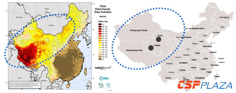 圖:中國(guó)西部沙漠地區(qū)DNI值普遍接近或超過(guò)2000kWh/m2/y(圖片來(lái)源:NREL)