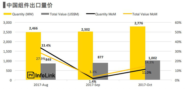 據(jù)PVInfoLink 最新的海關出口報告顯示,十月中國組件及電池片的出口量分別為2,776MW及349MW,較九月有11%及9.5%的增加。