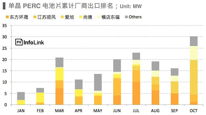 觀察全年PERC電池片的出口,在上半年順風與東方環(huán)晟的出口量互有千秋,但在今年年中開始,愛旭加入戰(zhàn)局,每個月的PERC電池出口持續(xù)攀升,并在今年九月、十月,都位居中國PERC電池片第一的寶座。預期待十一月數(shù)據(jù)出爐,愛旭今年累積PERC電池片出口量將超過順風,正式坐上出口PERC電池片的龍頭寶座。另外,橫店東磁的高效電池片出口量在十月也有顯著成長。