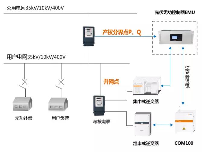 智慧陽光分布式電站無功控制解決方案,在光伏系統(tǒng)中安裝無功控制器EMU,實(shí)時(shí)采集產(chǎn)權(quán)分界點(diǎn)的P、Q,與預(yù)先設(shè)置的目標(biāo)功率因數(shù)進(jìn)行比較分析,計(jì)算出產(chǎn)權(quán)分界點(diǎn)所需的無功,并以廣播的方式快速給每臺(tái)逆變器下發(fā)指令,通過逆變器發(fā)出無功,來調(diào)節(jié)產(chǎn)權(quán)分界點(diǎn)的功率因數(shù),保證廠區(qū)功率因數(shù)實(shí)時(shí)滿足電網(wǎng)公司要求,不影響廠區(qū)的電能質(zhì)量以及廠區(qū)的有功發(fā)電,保證電網(wǎng)安全。