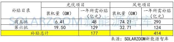 進(jìn)入前六批可再生能源補(bǔ)貼目錄的電站項(xiàng)目中,風(fēng)力發(fā)電項(xiàng)目和光伏發(fā)電項(xiàng)目裝機(jī)量占比超過95%,因此記者在可再生能源補(bǔ)貼測(cè)算中不涵蓋生物質(zhì)能和地?zé)崮艿妊a(bǔ)貼測(cè)算。經(jīng)測(cè)算,目前涵蓋在以發(fā)放的前六批可再生能源補(bǔ)貼目錄中,光伏項(xiàng)目每年所需要的補(bǔ)貼為177億元,風(fēng)電每年所需要的補(bǔ)貼為414億元。