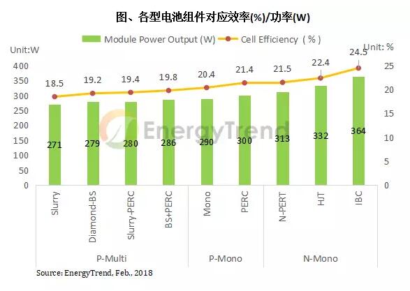 P型PERC電池技術(shù)已進(jìn)入大規(guī)模應(yīng)用,2017年P(guān)ERC電池建置產(chǎn)能高達(dá)42.38GW,較2016年的16.27GW成長(zhǎng)160.5%,單晶PERC電池的占比更超過(guò)75%。業(yè)者若要實(shí)現(xiàn)高標(biāo)水平,目前以P型PERC技術(shù)作為主軸搭配其他上述整合技術(shù)應(yīng)用,或者采用N型電池技術(shù)搭配雙面電池技術(shù)是最有機(jī)會(huì)的。不過(guò)N型雙面、HJT、IBC等技術(shù)仍屬于萌芽階段,且N型單晶硅片目前售價(jià)仍高于P型單晶硅片20%~30%以上,因此更適用于鼓勵(lì)未量產(chǎn)化技術(shù)的技術(shù)領(lǐng)跑者。