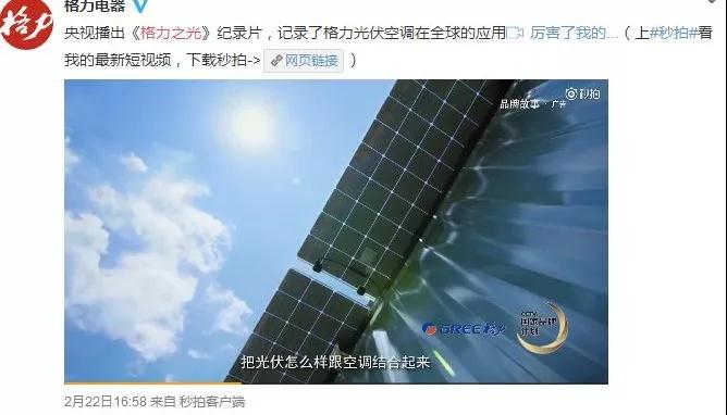 2月22日,格力電器官方微博發(fā)布了一則關(guān)于央視播出《格力之光》紀(jì)錄片的消息,主要記錄了格力光伏空調(diào)在全球的應(yīng)用,并配送了相應(yīng)的短視頻。