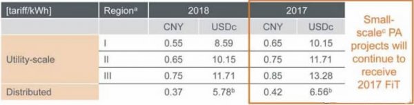 在以上新增裝機(jī)中,除了領(lǐng)跑者計(jì)劃實(shí)行競(jìng)標(biāo)以外,其他光伏項(xiàng)目均以標(biāo)桿電價(jià)(feed-in-tariff)方式實(shí)施。如下表所示,盡管中國(guó)的光伏標(biāo)桿電價(jià)數(shù)度下調(diào),但是大型地面光伏的標(biāo)桿電價(jià)依然高于10美分/千瓦時(shí),數(shù)倍于近來(lái)國(guó)際光伏競(jìng)標(biāo)價(jià)格。所以,國(guó)外業(yè)界有觀點(diǎn)認(rèn)為中國(guó)的光伏大躍進(jìn)是高額補(bǔ)貼出來(lái)的。