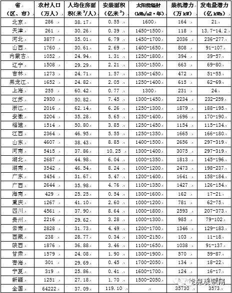 初步估算表明,我國(guó)住宅屋頂分布式光伏裝機(jī)技術(shù)潛力為4.3億千瓦,潛在發(fā)電量為4276億千瓦時(shí)。其中,城市屋頂可安裝面積約23.42億平方米,裝機(jī)潛力約7026萬(wàn)千瓦,發(fā)電量潛力約702.6億千瓦時(shí);農(nóng)村屋頂可安裝面積約119.10億平方米,裝機(jī)潛力約3.57億千瓦,發(fā)電量潛力約3573億千瓦時(shí)。