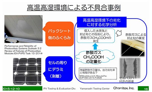 查明了劣化機(jī)制后,就能確定對策的方向。對此次的事例,已對封裝材料使用的EVA,采取了必要措施等,在由太陽能電池板廠商和材料廠商努力加以改善。