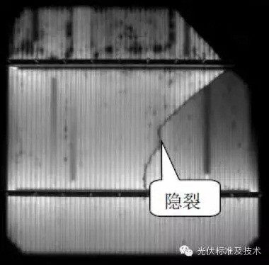 (1)產(chǎn)生原因:電池片在生產(chǎn)制造過程中,由于在焊接或搬運(yùn)過程中受到外力作用造成;電池片在低溫下沒有經(jīng)過預(yù)熱在短時(shí)間內(nèi)突然受到高溫后出現(xiàn)膨脹造成隱裂現(xiàn)象。(2)成像特點(diǎn):由于單晶硅的解離面具有一定的規(guī)則,通過EL成像圖可以清晰地看到單晶硅電池片的隱裂紋呈現(xiàn)“x”狀圖形;多晶硅電池片由于晶界的影響有時(shí)很難區(qū)分是多晶硅的晶界還是電池片中的隱裂紋。裂紋片的成像特點(diǎn)是裂紋在EL測(cè)試下產(chǎn)生明顯的明暗差異的紋路(黑線)。如圖2、3所示。(3)組件影響:組件隱裂后,長(zhǎng)時(shí)間運(yùn)行會(huì)造成組件功率衰減;經(jīng)過一段時(shí)間積累后,組件會(huì)出現(xiàn)熱斑現(xiàn)象,直接造成組件損壞。