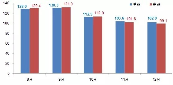 下圖:每千瓦單晶與多晶月度發(fā)電量統(tǒng)計(KWh)
