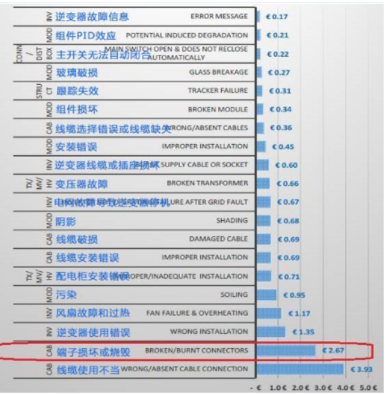 光伏連接器,又稱MC接頭,在光伏系統(tǒng)中,連接器占比很小,但很多環(huán)節(jié)都需要用到,比如接線盒、匯流箱、組件和逆變器之間的線纜連接都需要。很多施工人員對(duì)連接器認(rèn)識(shí)不足,由于連接器的問(wèn)題引發(fā)電站故障可不少,2016年7月‘solarbankability’發(fā)布的另一份報(bào)告《影響光伏發(fā)電因素回顧和分析》報(bào)告中,在電站TOP20影響因素中,連接器損壞或燒毀造成的發(fā)電量損失排在第2位。